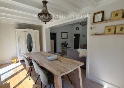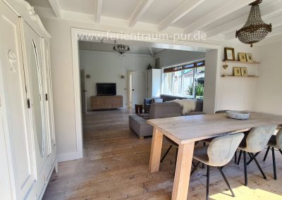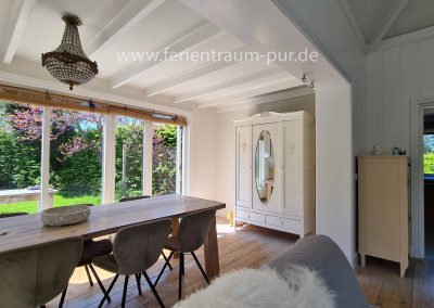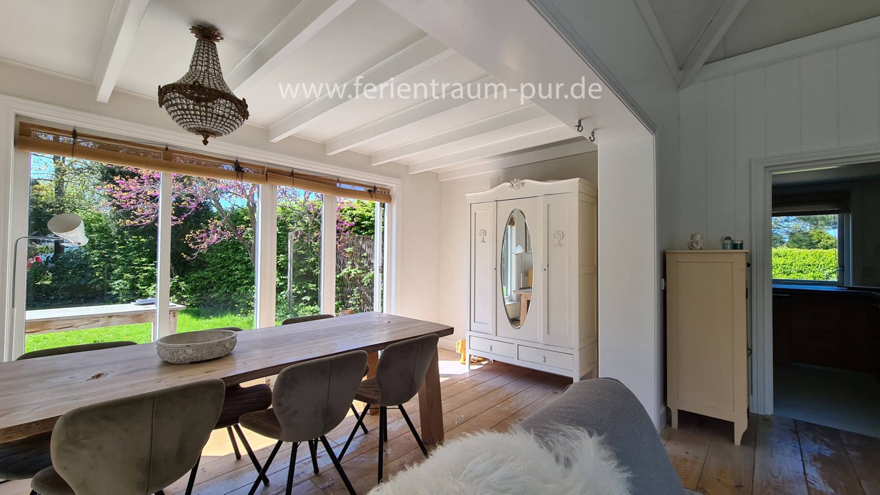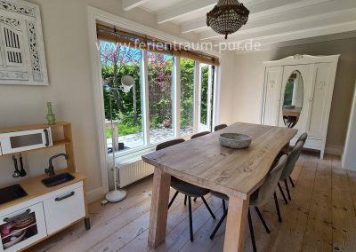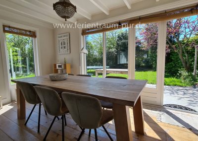 Großzügiger Eßplatz mit großem modernen Eßtisch und 6 Stühlen, Schrank und tollem Blick in den Garten.