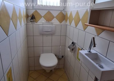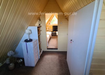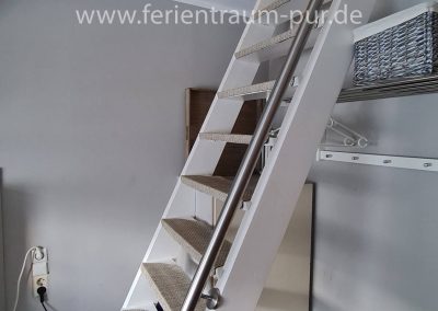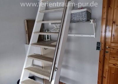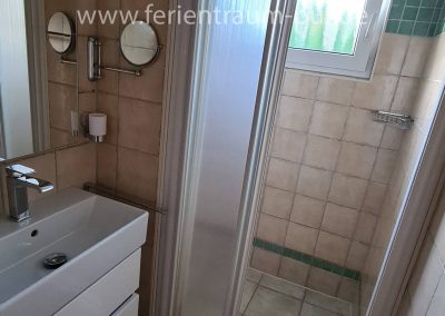 Badezimmer mit Dusche und Waschbecken. Separates WC mit Waschbecken, beide Räume mit sehr schönen Fliesen. Abstellraum mit Kombiwaschmaschine mit Trockner. Von hier führt eine steile Holztreppe nach oben, wo sich der andere Schlafraum befindet.