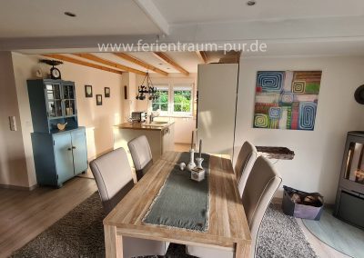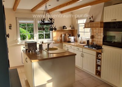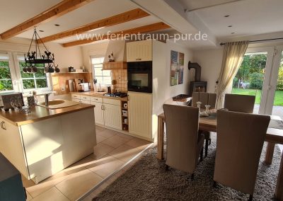 Essplatz, Moderne Küche im Landhausstil mit Insel. Küchenausstattung: 4-Platten Elektroherd, Air Fryer, Strom-Backofen, Kühlschrank, Geschirrspüler, Küchenmaschine, Toaster, Wasserkocher, Eierkocher, Mixer, 1 Kaffee-Vollautomat, 1 herkömmliche Kaffeemaschine.