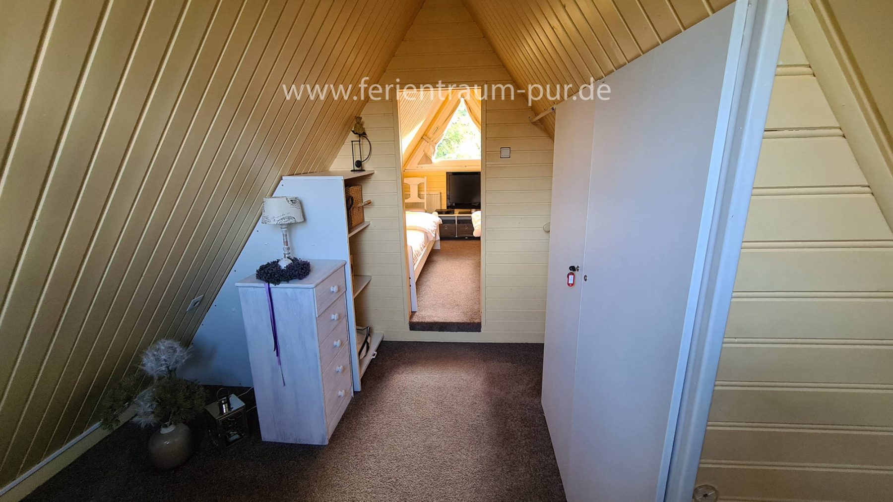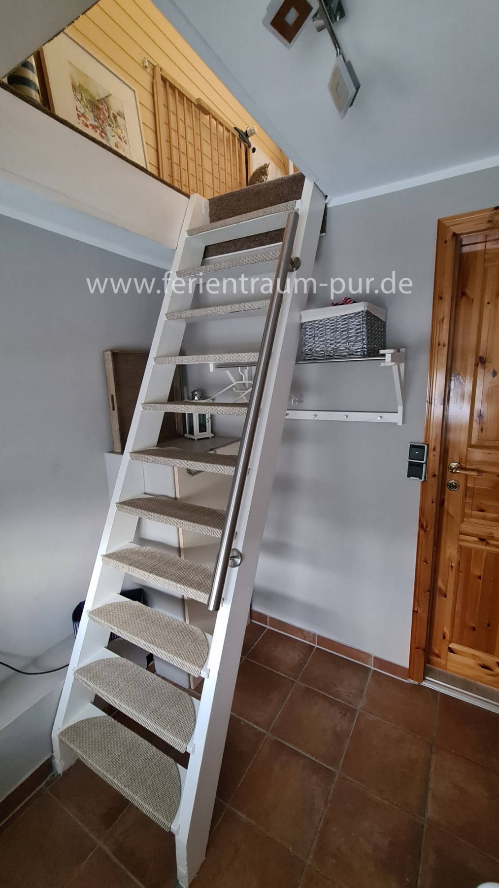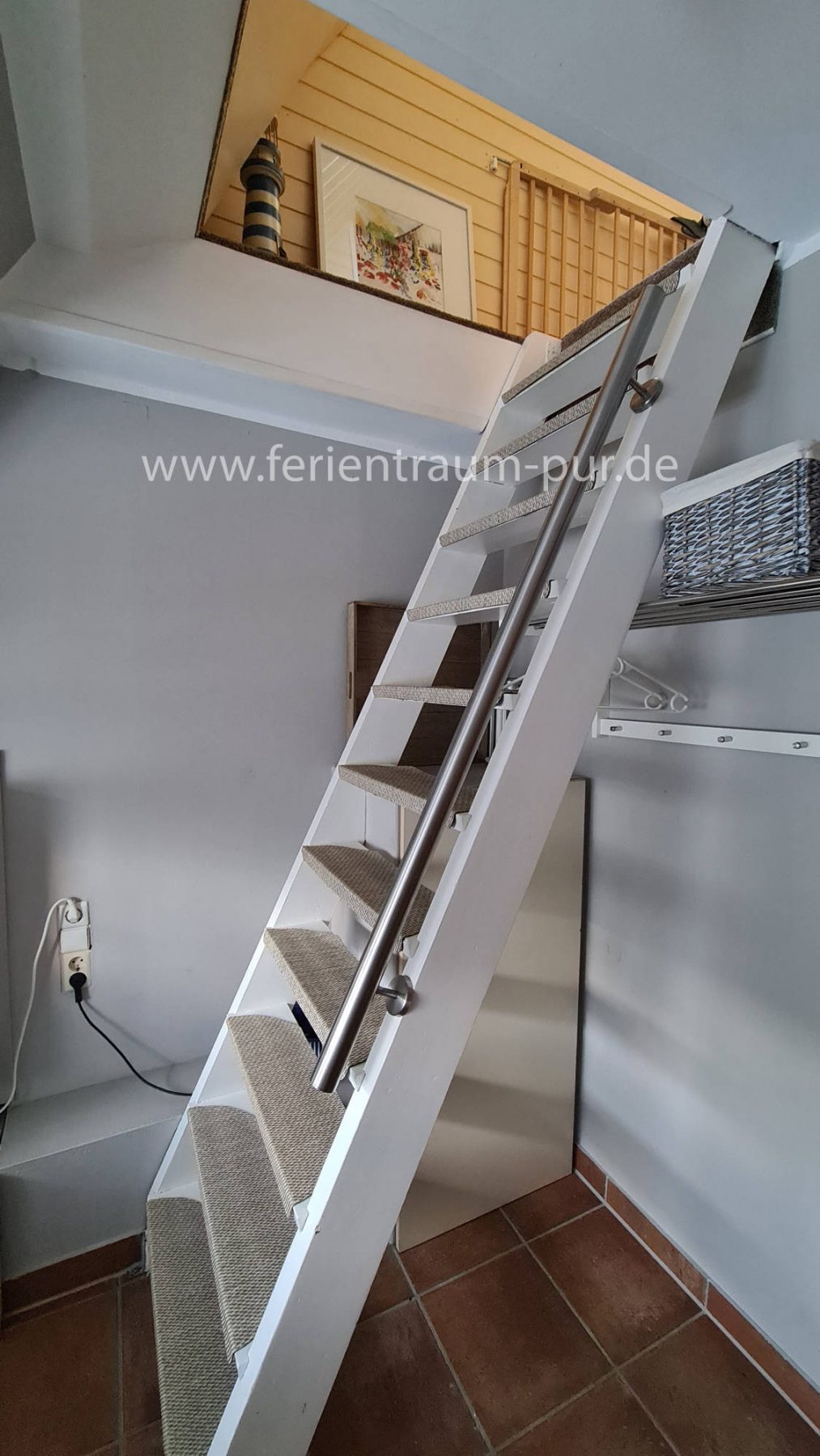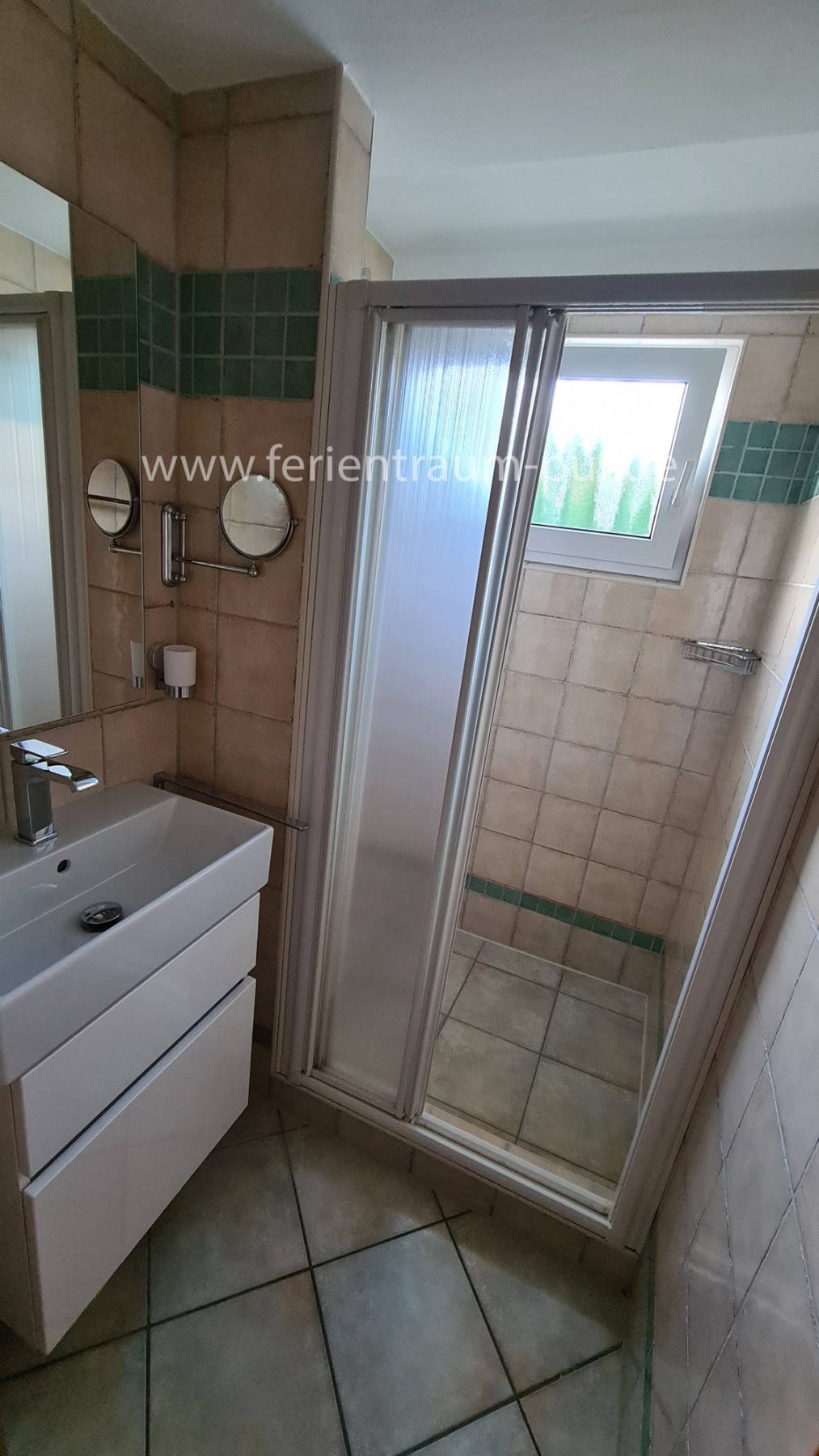 Badezimmer mit Dusche und Waschbecken. Separates WC mit Waschbecken, beide Räume mit sehr schönen Fliesen. Abstellraum mit Kombiwaschmaschine mit Trockner. Von hier führt eine steile Holztreppe nach oben, wo sich der andere Schlafraum befindet.