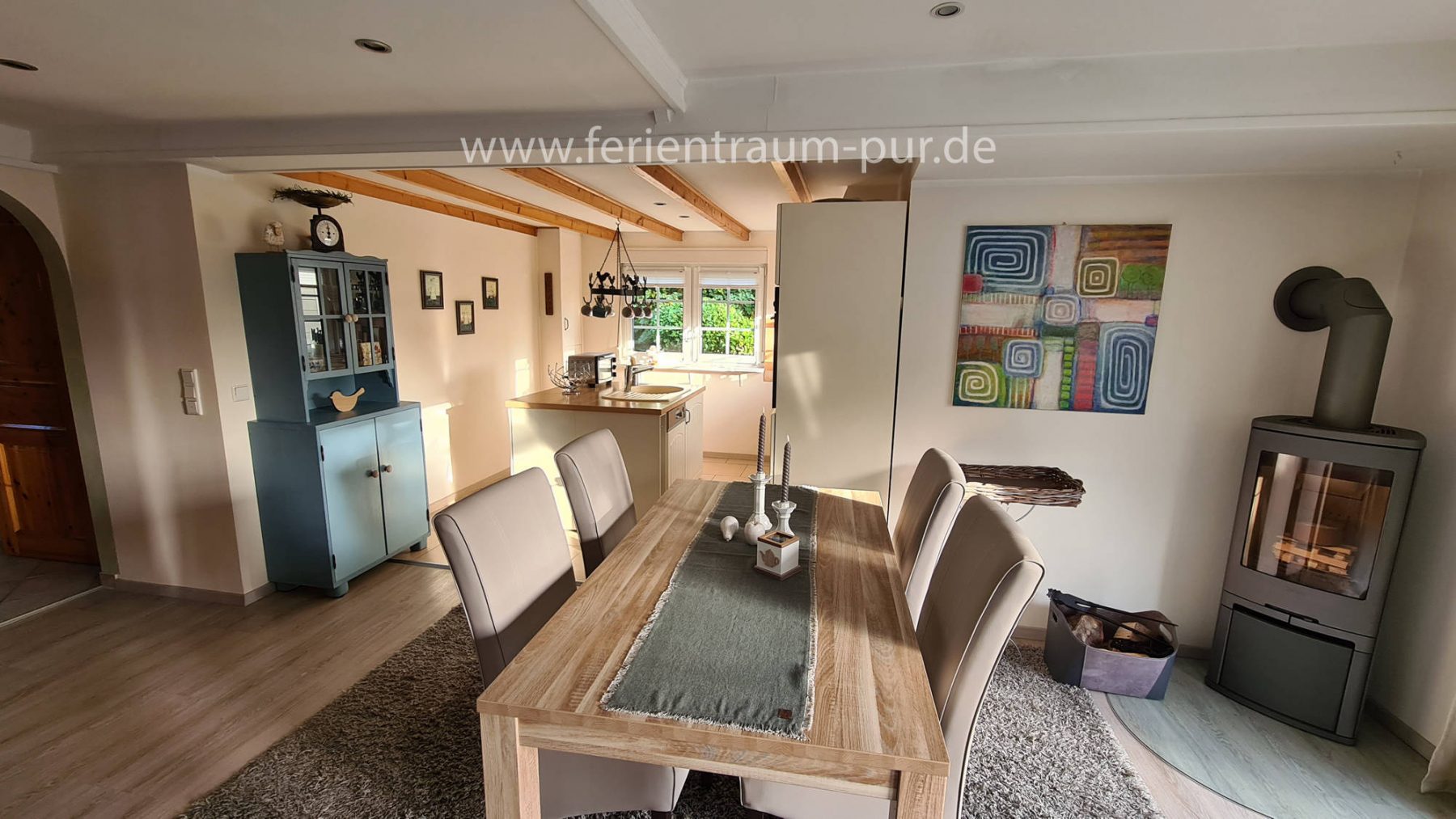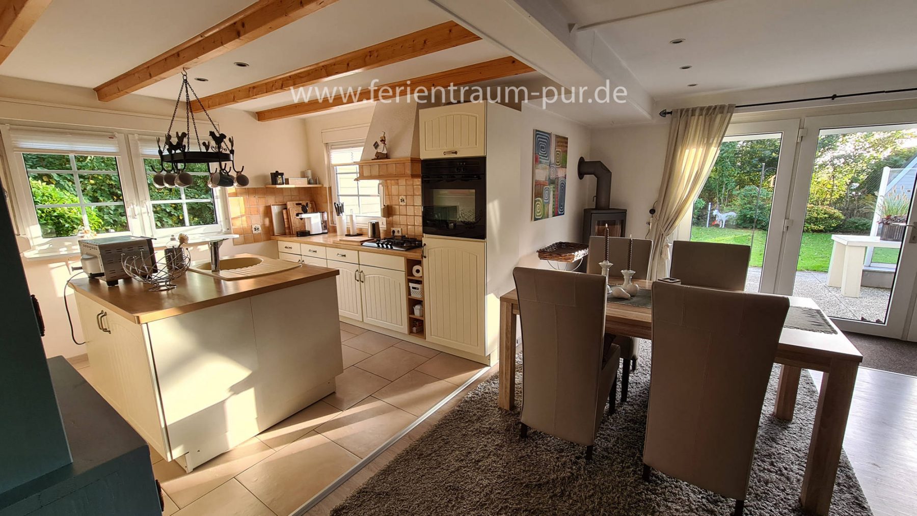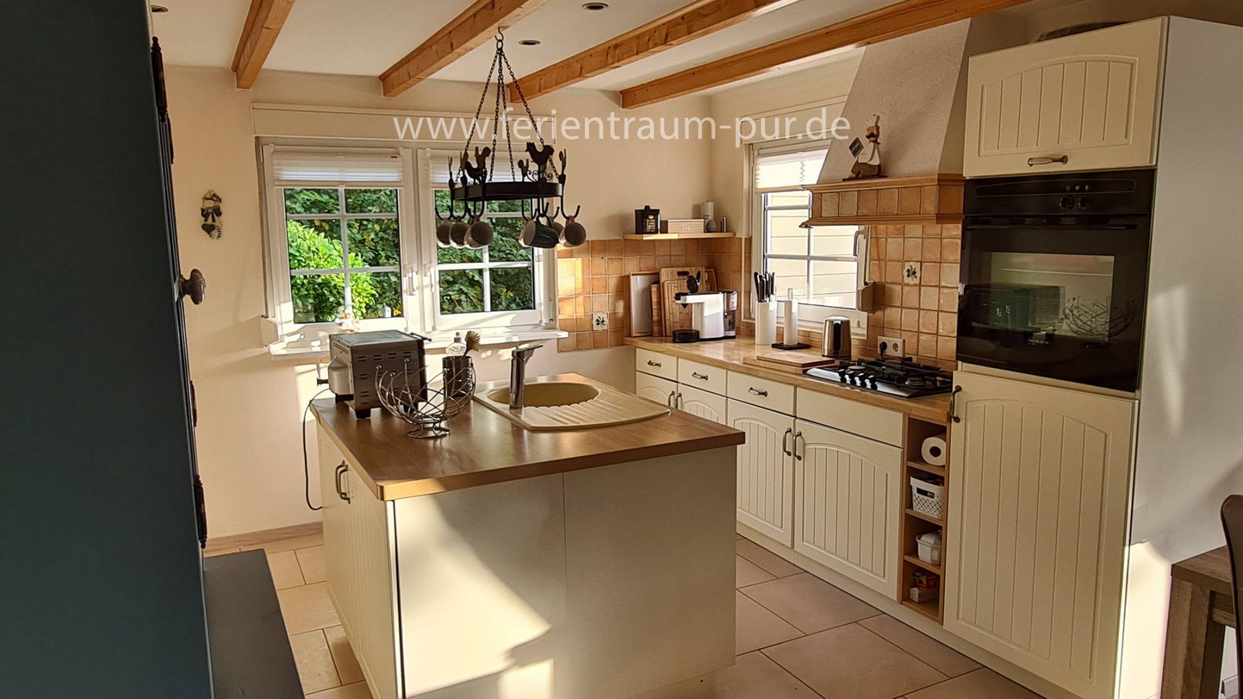 Essplatz, Moderne Küche im Landhausstil mit Insel. Küchenausstattung: 4-Platten Elektroherd, Air Fryer, Strom-Backofen, Kühlschrank, Geschirrspüler, Küchenmaschine, Toaster, Wasserkocher, Eierkocher, Mixer, 1 Kaffee-Vollautomat, 1 herkömmliche Kaffeemaschine.