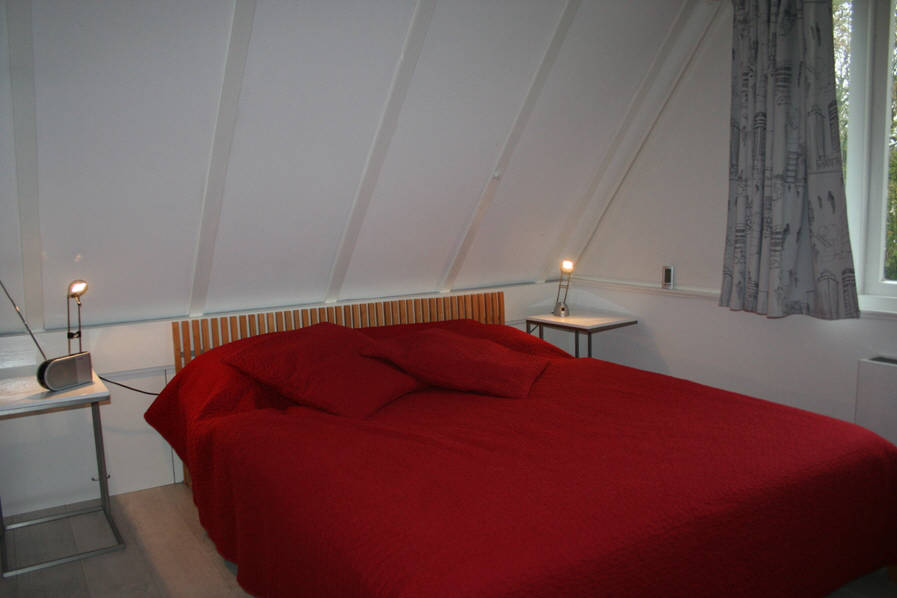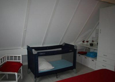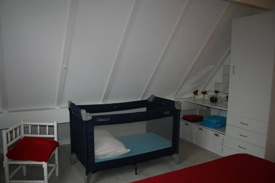 1 Schlafzimmer im OG mit 1 Doppelbett 1,60 x 2 m, 2 Nachttischchen und einem Kleiderschrank. Ein Kinderreisebett mit guter Matratze, 1 kleines Radio, 1 Sessel.