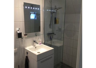 Badezimmer mit Dusche, Waschbecken, WC mit erhöhtem Sitz.