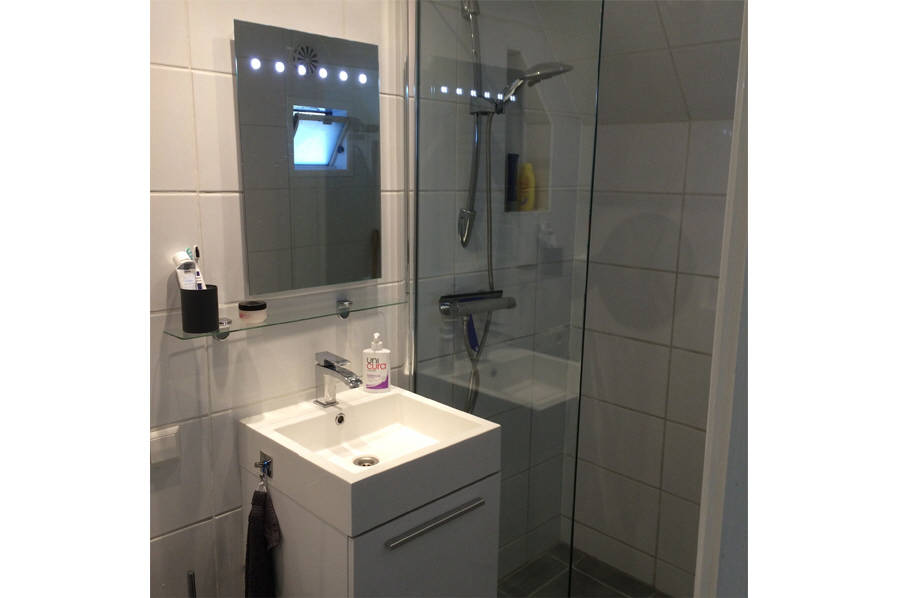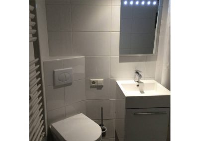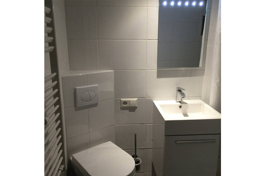 Bodenbeläge: graues Laminat, Bad: Fliesen