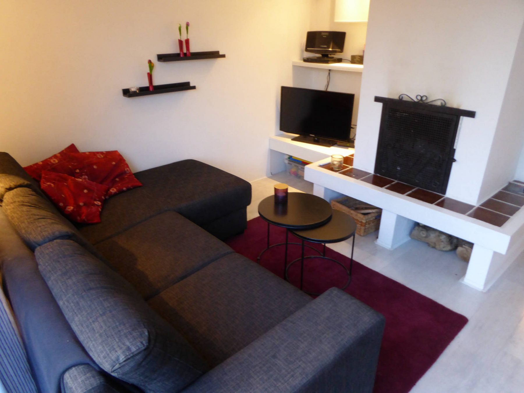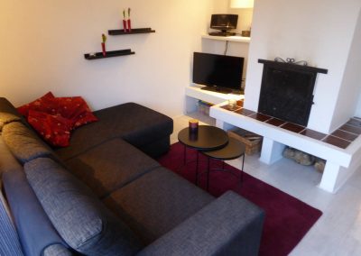 Wohnzimmer mit einer modernen, bequemen Eckcouch, offenem Kamin, Flachbildschirm mit fünf deutschen Programmen, DVD Rekorder mit integriertem CD Player, Kinderspiele.
